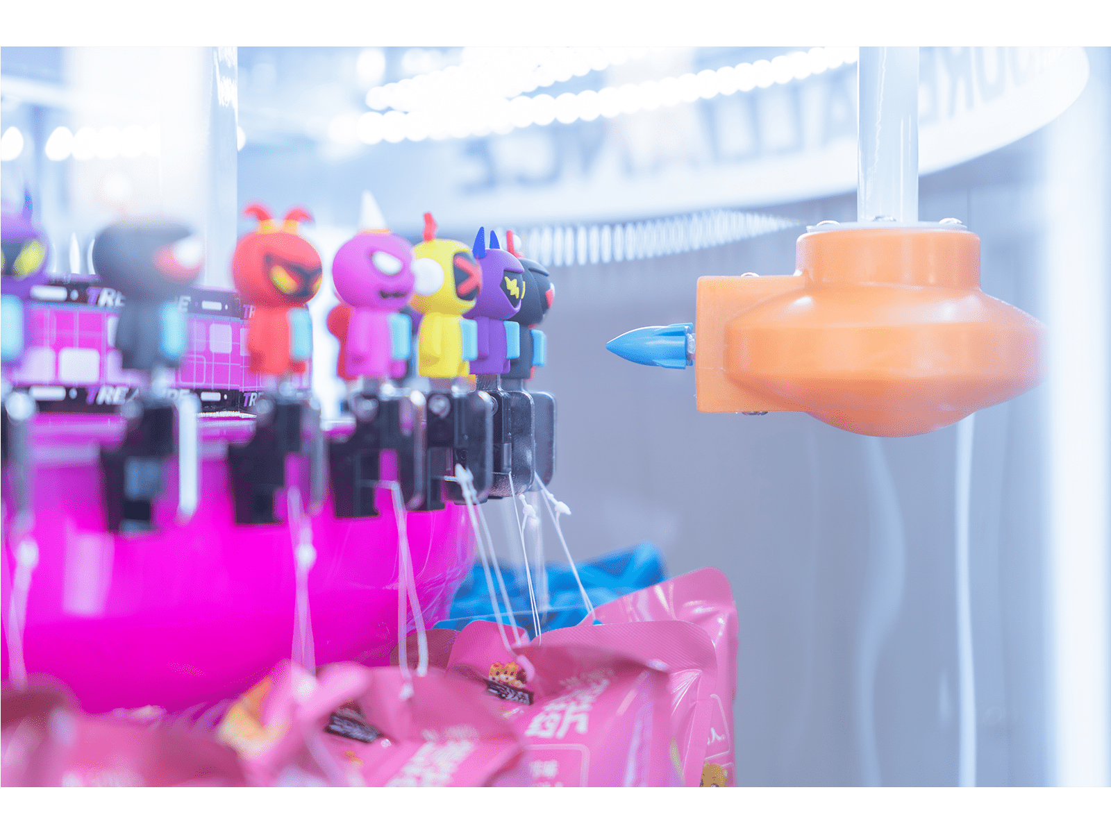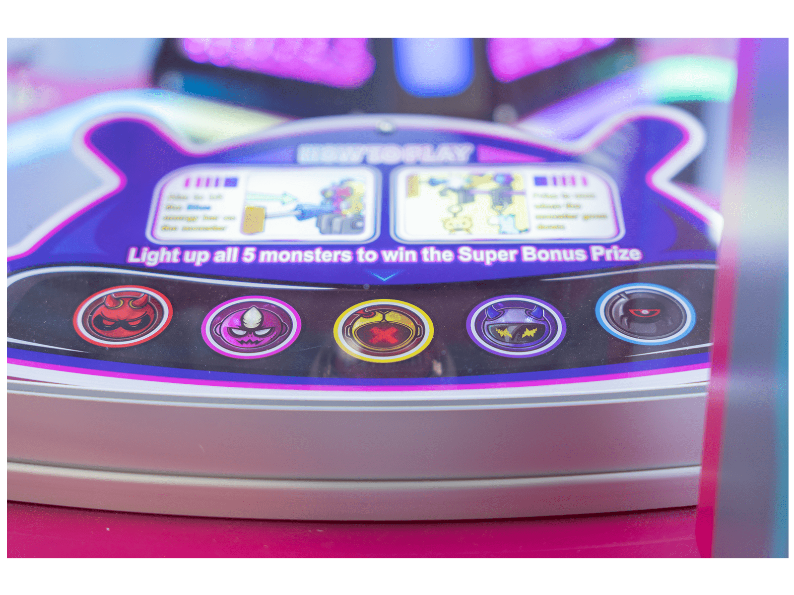 Există cinci monștri colorați diferiți, fiecare cu bară de energie, care păzesc premiile fixate în aparat.
