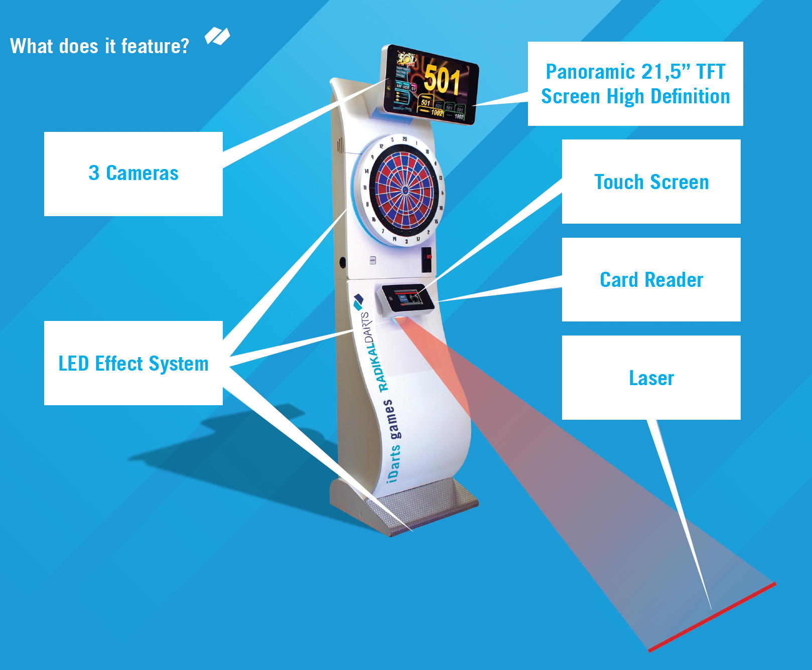 Aparatele Radikal Darts revoluționează jocul datorită unui sistem avansat de camere cu arbitraj de la distanță. Trei camere de înaltă definiție lucrează împreună pentru a surprinde fiecare detaliu: ținta, jucătorul și zona de aruncare. Astfel, operatorii beneficiază de o vizualizare completă a jocului, putând valida sau anula rezultatele cu certitudine absolută.