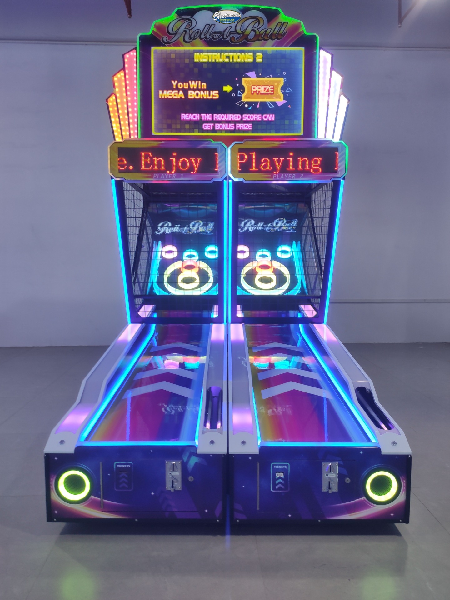 Roll-A-Ball este prezentat într-un cabinet modern și atrăgător, dotat cu iluminare LED și grafică vibrantă, menite să îmbunătățească atât aspectul, cât și experiența de joc. Împreună cu panoul superior luminos, care afișează scorurile jucătorilor și funcțiile din timpul jocului, aparatul devine un adevărat punct de atracție în orice locație.